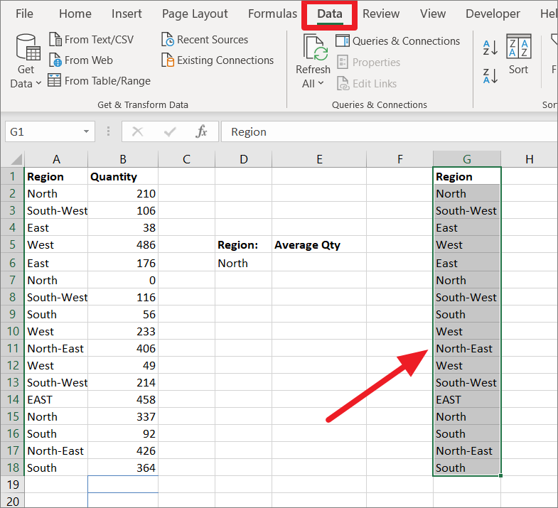 Suppose, you have the below dataset with the number of sales in differnt regions and you want to find the average quantity for different regions.