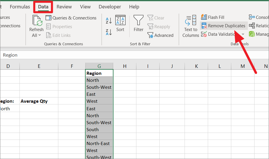 Under the Data tab, click the ‘Remove Duplicate’ button in the Data Tools group.