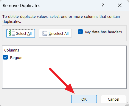 In the Remove Duplicates dialog box, make sure the column name (Region) is checked and click ‘OK’.