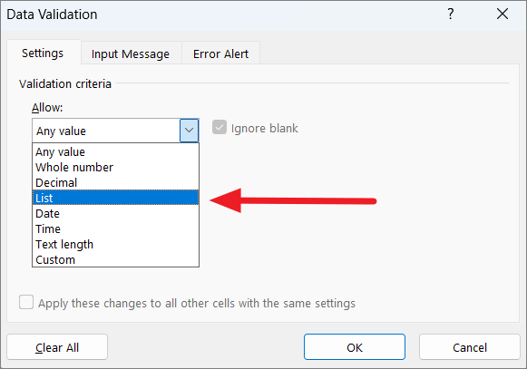 In the Data validation dialog window, choose ‘List’ from the Allow drop-down under Validation Criteria.