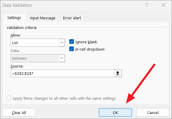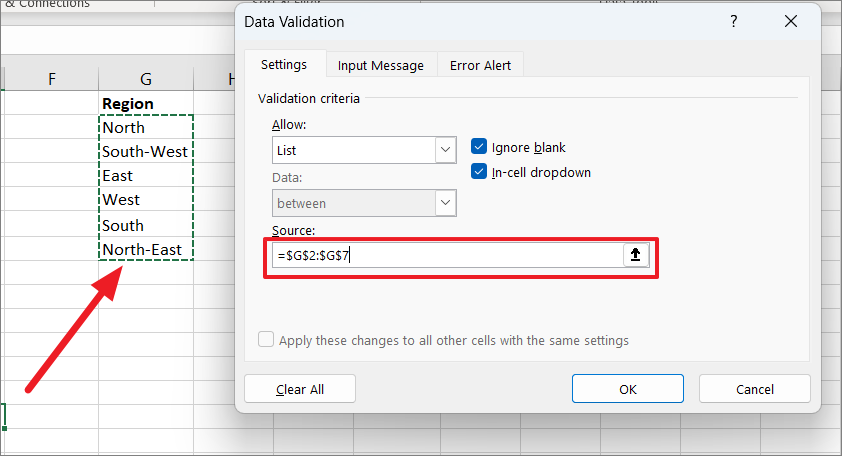 Next, click on the ‘Source’ field and select the range of cells that you want in your drop-down list.