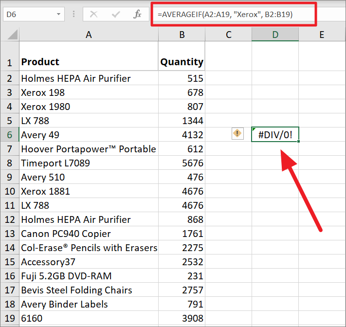 But the list contains different xerox products with different model numbers. If you simply use “Xerox” as criteria in the AVERAGEIF formula, you will end up with #DIV/0! error.