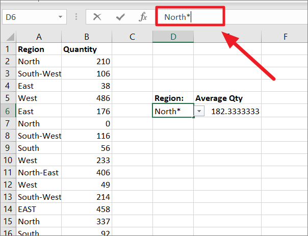 If we want to get the average of all of the northern regions including ‘North’ and ‘North-East’, we can add the asterisk (*) wildcard followed by ‘North’ in the cell D6 as shown below