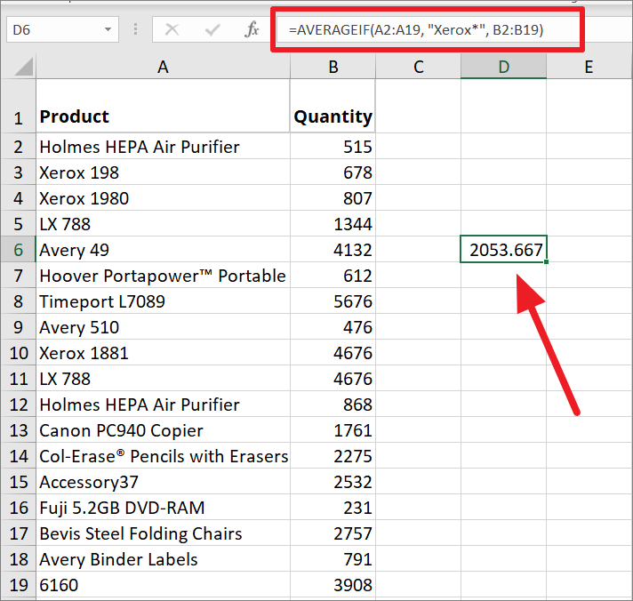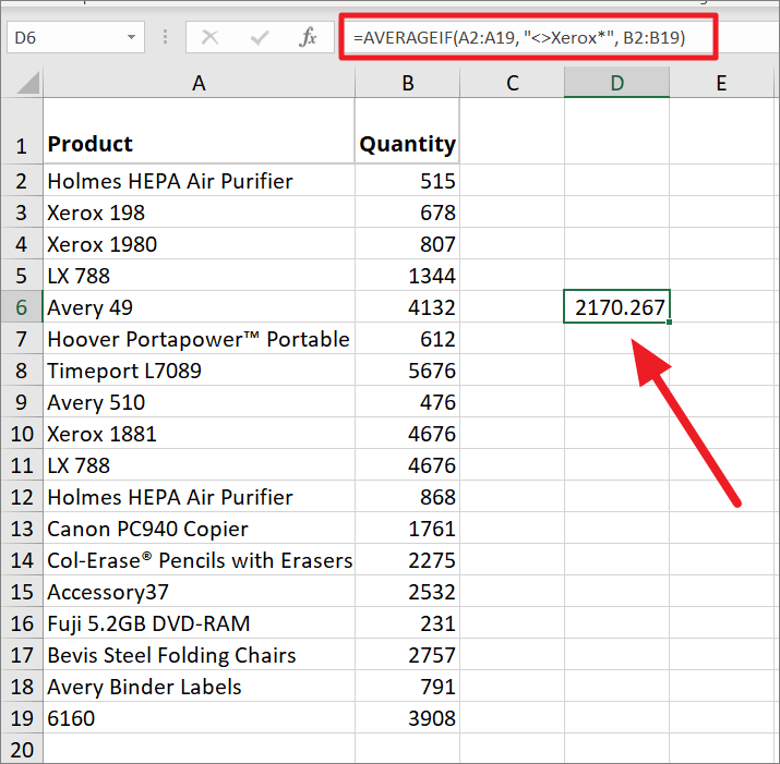 In case you need to find the average quantity of all items excluding any ‘Xerox’ product, write the below formula: