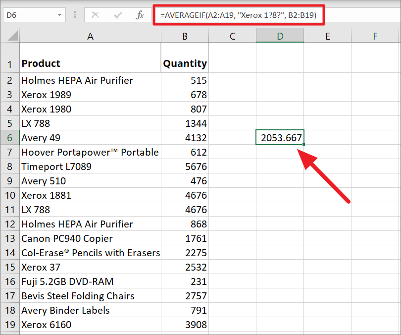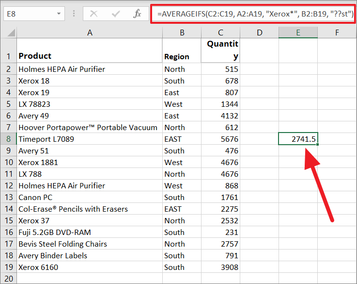 =AVERAGEIFS(C2:C19, A2:A19, "Xerox*", B2:B19, "??st")In the above formula, the criteria Xerox* matches with all the Xerox products in column A and ??st matches with South or East corresponding to any of those Xerox products. When both conditions are satisfied, it calculates the average quantity from column C.