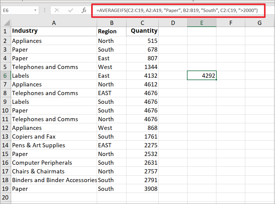 =AVERAGEIFS(C2:C19, A2:A19, "Paper", B2:B19, "South", C2:C19, ">2000")Here is the list of items in column A, a region in column B, and the number of products shipped in column C. The above formula includes three criteria – two texts and one combination of logical operator and number. All three criteria must be satisfied to return the result.