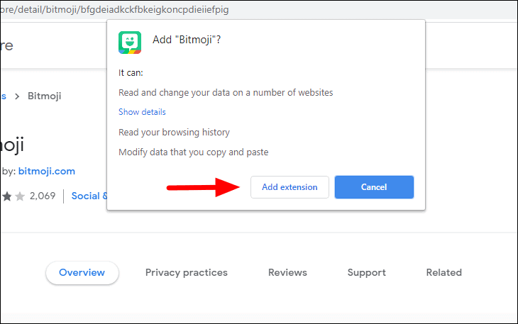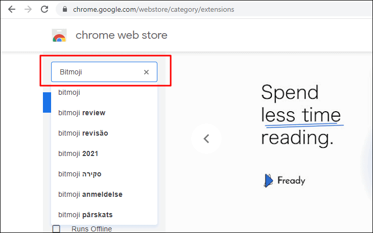 Go to chrome.google.com/webstore, then type ‘Bitmoji’ in the search box at the top-left corner and hit ENTER.