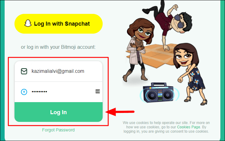 The Bitmoji extension will download and a new tab will open on the browser. Enter the log-in details you had set up on the app earlier and then click on ‘Log In’ at the bottom.