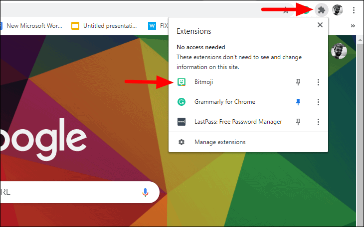 Click on the ‘Extensions’ icon at the top-right corner of Chrome and then select ‘Bitmoji’ from the list.