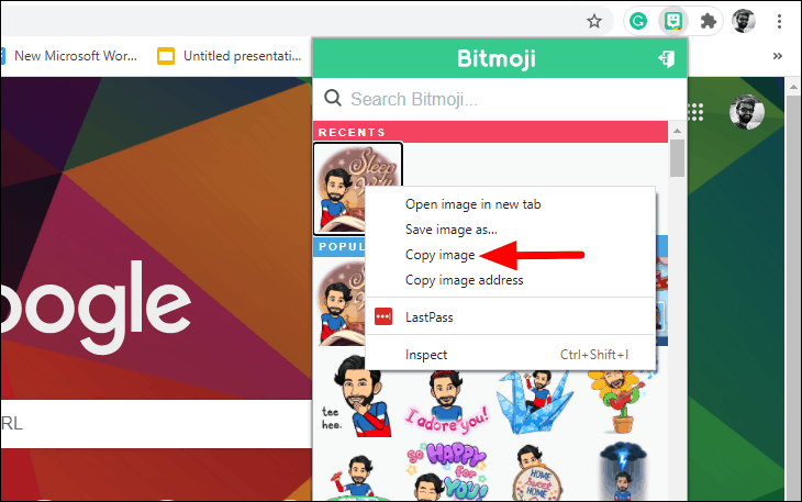 Next, select Bitmoji from the extensions list and then search a Bitmoji avatar or select one from the list. To choose a Bitmoji, right-click on it and select ‘Copy image’ from the context menu.
