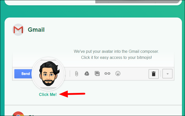 Add Bitmoji to Gmail. Once you have logged in, you’ll get the option to set up Bitmoji for Gmail. Scroll down the screen and click on the ‘Click Me’ button under the Gmail box to add Bitmoji to Gmail if you want to use your avatar in emails.