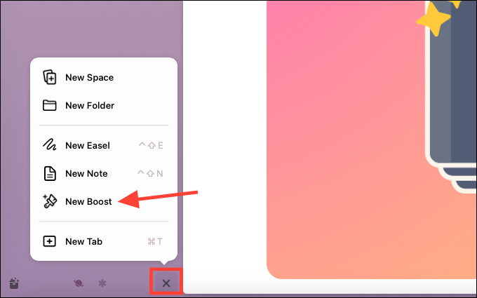 - Alternatively, you can click on the Plus (+) button (it changes to X when the menu is open) located in the bottom right of your sidebar and select 'New Boost' from the menu.