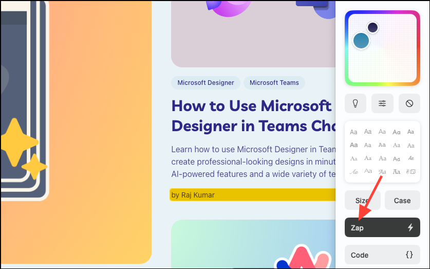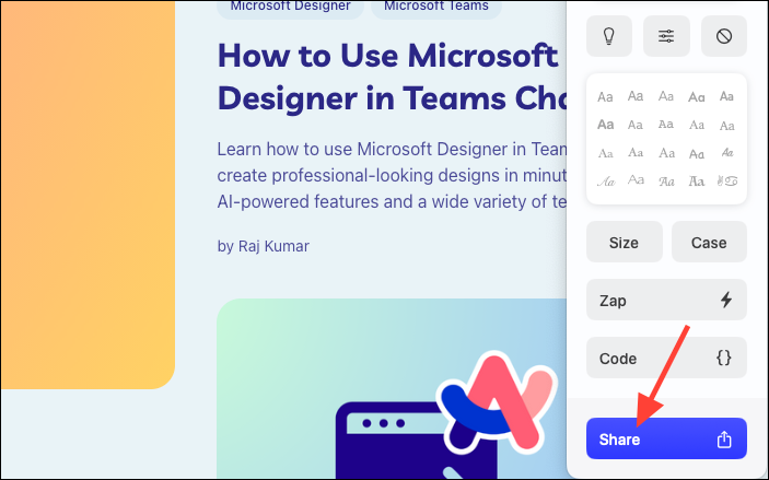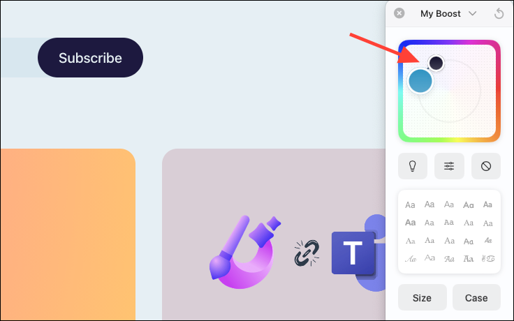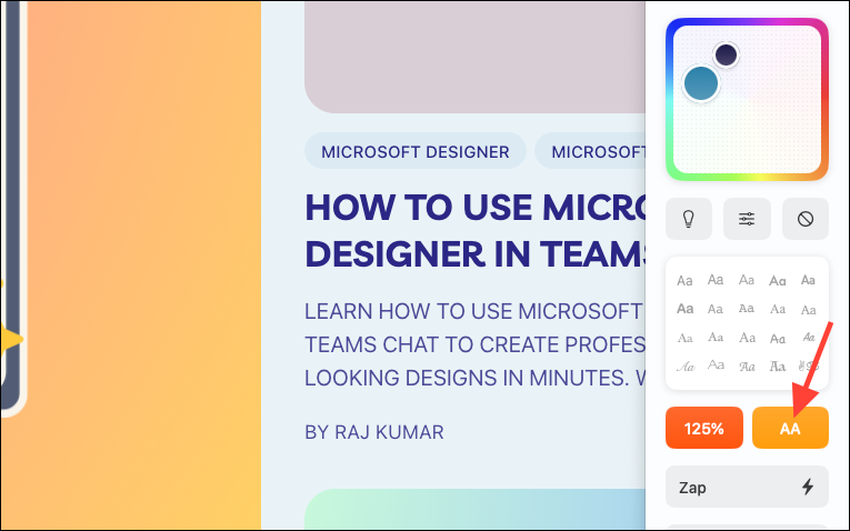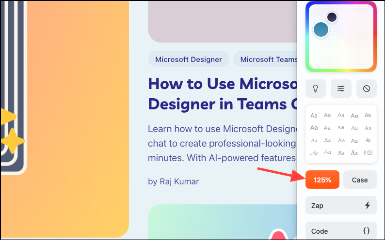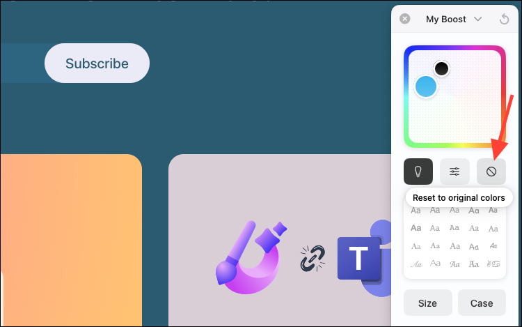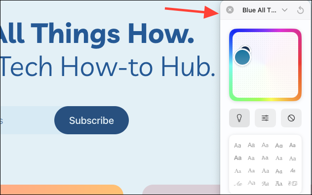- Font Selector: The square with different Aa selectors. Select among various preset font options for text on the webpage; it'll apply to all the text on the page.