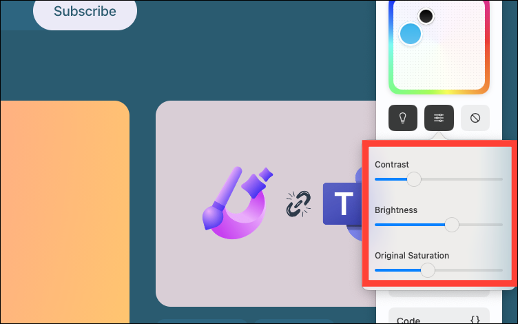 - Advanced Color Controls: The slider icon. You can adjust the Contrast, Brightness, and Original Saturation using sliders; move them to different places and experiment with them.
