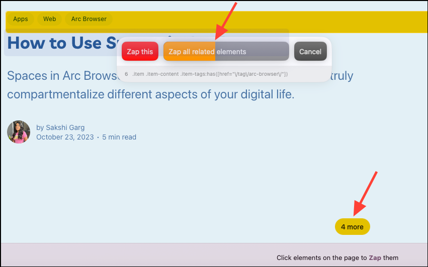 - A couple of options will appear. 'Zap This' will only remove the current element. 'Zap All Related Elements' will identify other elements related to it that you might want to remove. This button sort of works like a slider; as you move left to right on the 'Zap All Related Elements' button, you'll find that the extent of related elements that'll be zapped will keep on increasing. You can see the elements that will be removed as they will be highlighted and their number will be indicated at the bottom. Settle your cursor on the position depending on the amount of elements you want to remove and click the button.