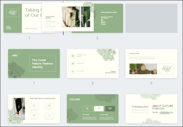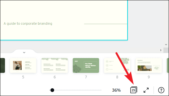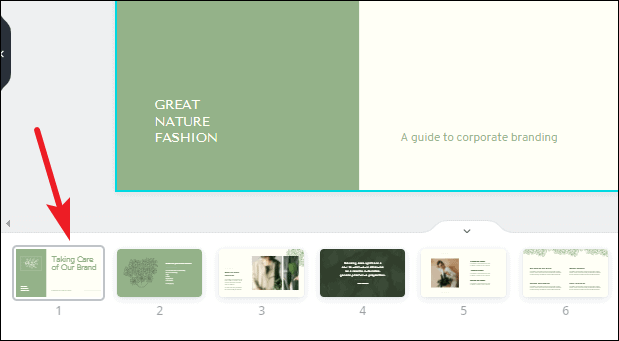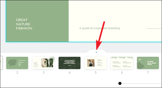 The template will load into the editing interface. Canva has an eerily easy editing interface. Let’s navigate the interface first. Below the slide is the thumbnail view where you can see all the slides in thumbnails side by side.