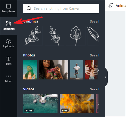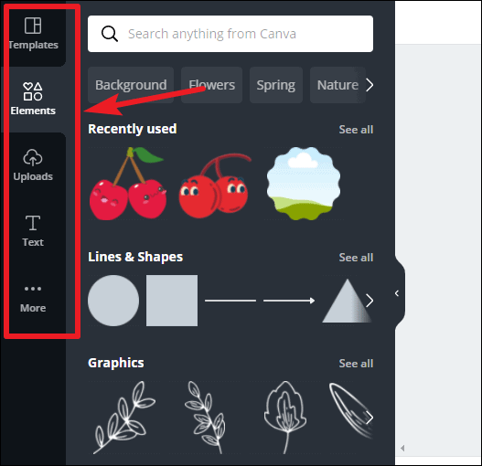 Click on the ‘Elements’ option on the left toolbar to add elements like photos, videos, graphics, audio, charts, etc. to your presentation.