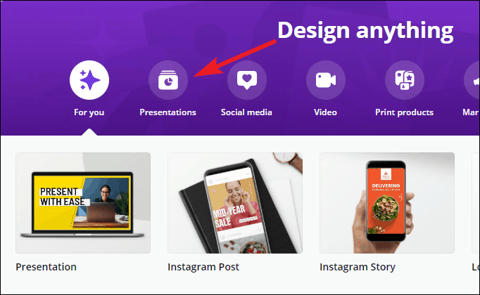 Now, from the Canva home page, click the ‘Presentations’ button under the Design anything banner. If you can’t find the option, you can also search for ‘Presentation’ from the search bar.