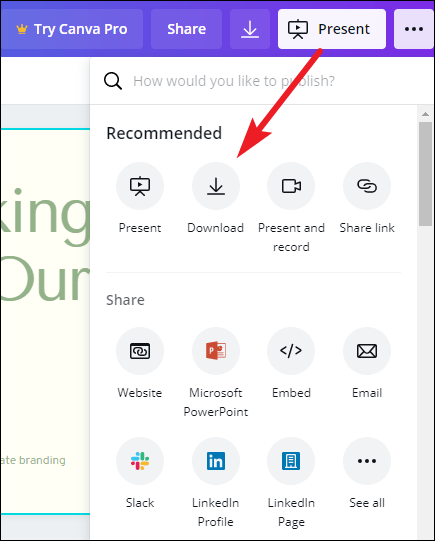 Once your presentation is complete comes the main part – presenting it. Canva offers a lot of options for your finished presentation. You can present it right from Canva or publish or download it for various platforms.