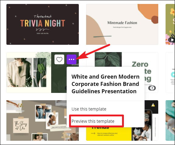 For this guide, we are selecting a template for the presentation. Before selecting a template, you can see what it has to offer by clicking the three-dot menu and selecting ‘Preview this template’.