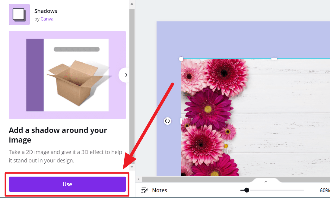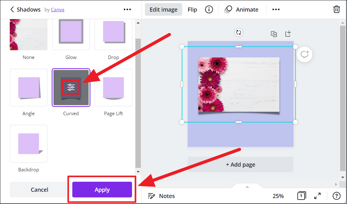 Canva features its own ‘Shadows’ app that helps add shadows to static images, thus making them 3D. You will first need to connect with the app to use it. Shadows offer 6 basic 3D effects – Glow, Drop, Angle, Page Lift, Curved, and Backdrop.