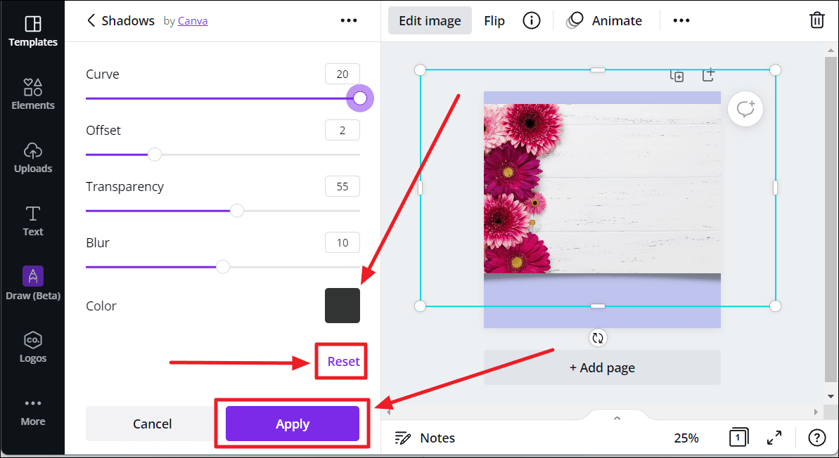 You can now choose to make adjustments to the curve, offset, transparency, blur, and color of your selected shadow effect. Either click and drag the toggles on the respective sliders or type in specific numbers in the respective boxes to make these changes.