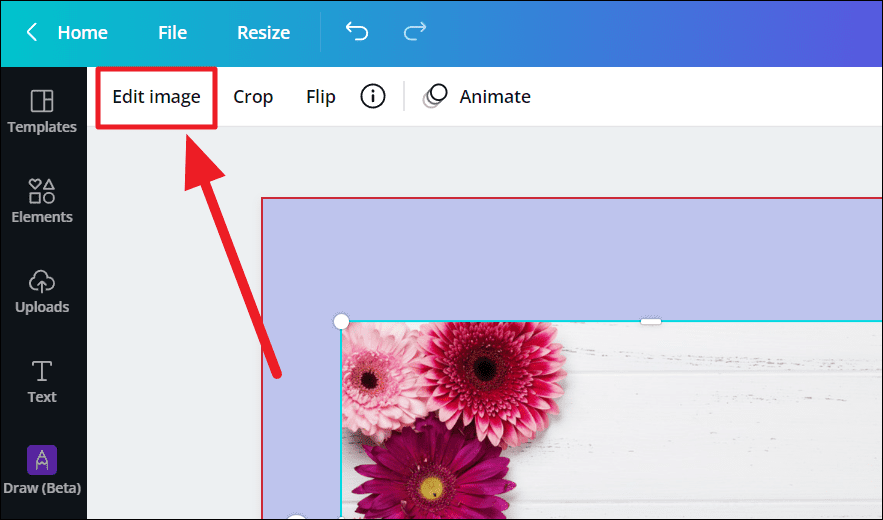 First, launch Canva on any device, as an app or on the web, and open the image or parts of it you wish to make 3D. Then, select the image and click the ‘Edit image’ option above the selected image.