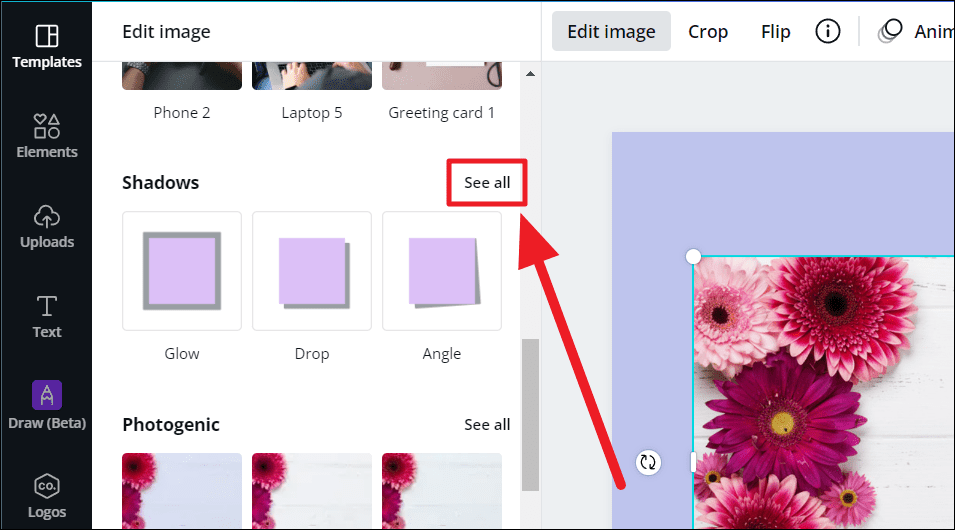 You’re now connected to the app. Scroll back up, above the ‘You may also like’ section to find the ‘Shadows’ app integrated into your image editing options. Click the ‘See all’ option next to the app’s title to view all the shadow effects.