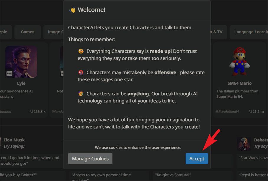 First, head to beta.character.ai using your preferred browser. Then, click on the 'Accept' button to proceed.