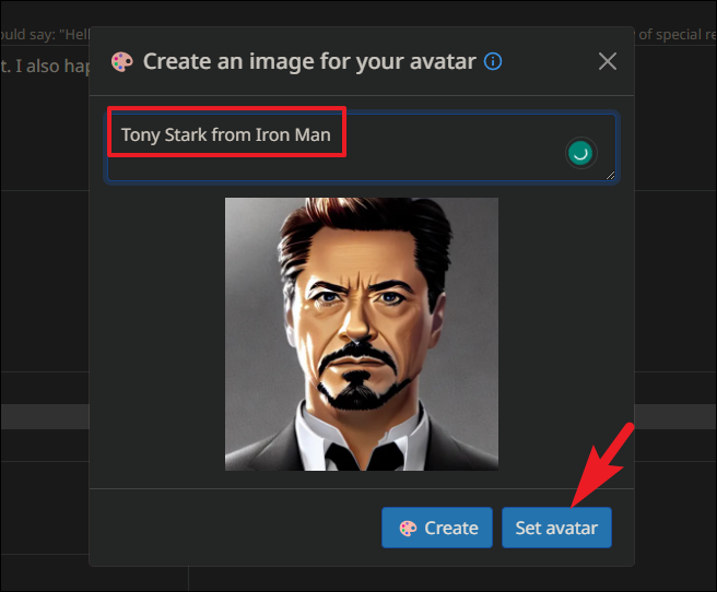 If you click on the 'Create Image' option, you must provide a prompt for the image you wish to create. Once the image is generated from the prompt, click the 'Set Avatar' button. To generate a new image, enter a new prompt and click on the 'Create' option.
