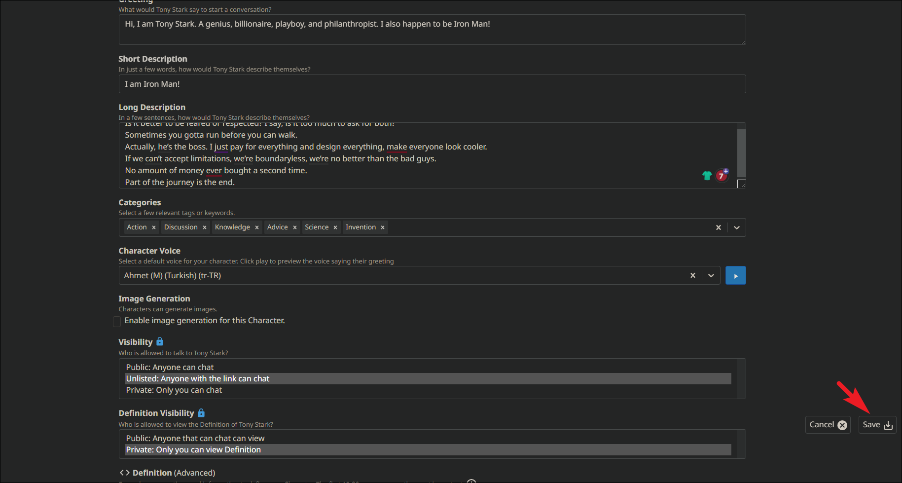 - Visibility: As you might have already guessed, this field defines who can access your AI. If you wish to train it specifically, keeping it private or Unlisted is better. Select the 'Public' option to let everybody access your character.