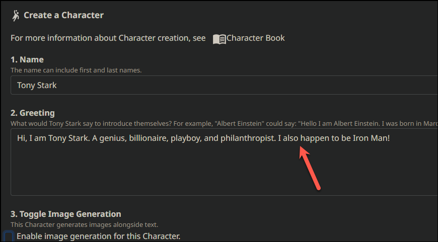 After that, set up the basic details for your character, like Name, Greeting, Visibility, Image generation alongside the text, and its avatar.