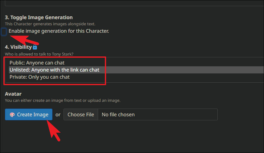 It is also essential to set the 'Visibility' settings right. If you are building a character for a specific reason, it is best to keep it 'Unlisted' or 'Private' as it may learn things you do not wish to when interacting with someone else on the platform. Once you have filled in all the necessary details, click the 'Create Image' option to create an avatar for your AI. If you already have an apt picture in your local storage, Â click on the 'Choose file' option.
