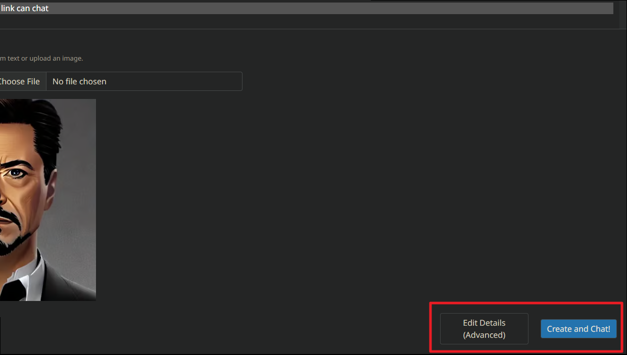 After that, if you cannot wait to chat with your chatbot, click the 'Create and chat' button in the bottom right corner. Otherwise, if you wish to configure the chatbot in more detail, click the 'Edit Details' button.