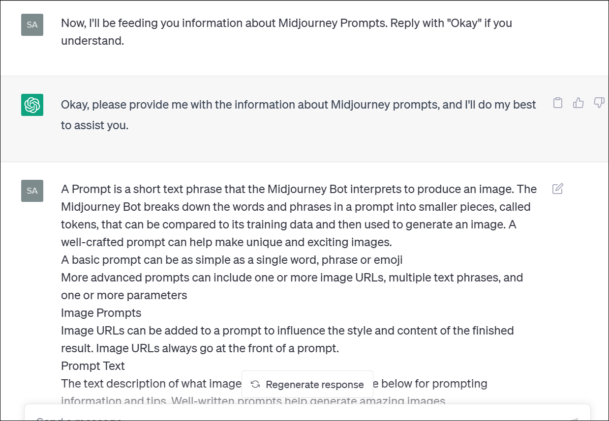 Start by explaining to ChatGPT what Midjourney is and how it functions. For example: