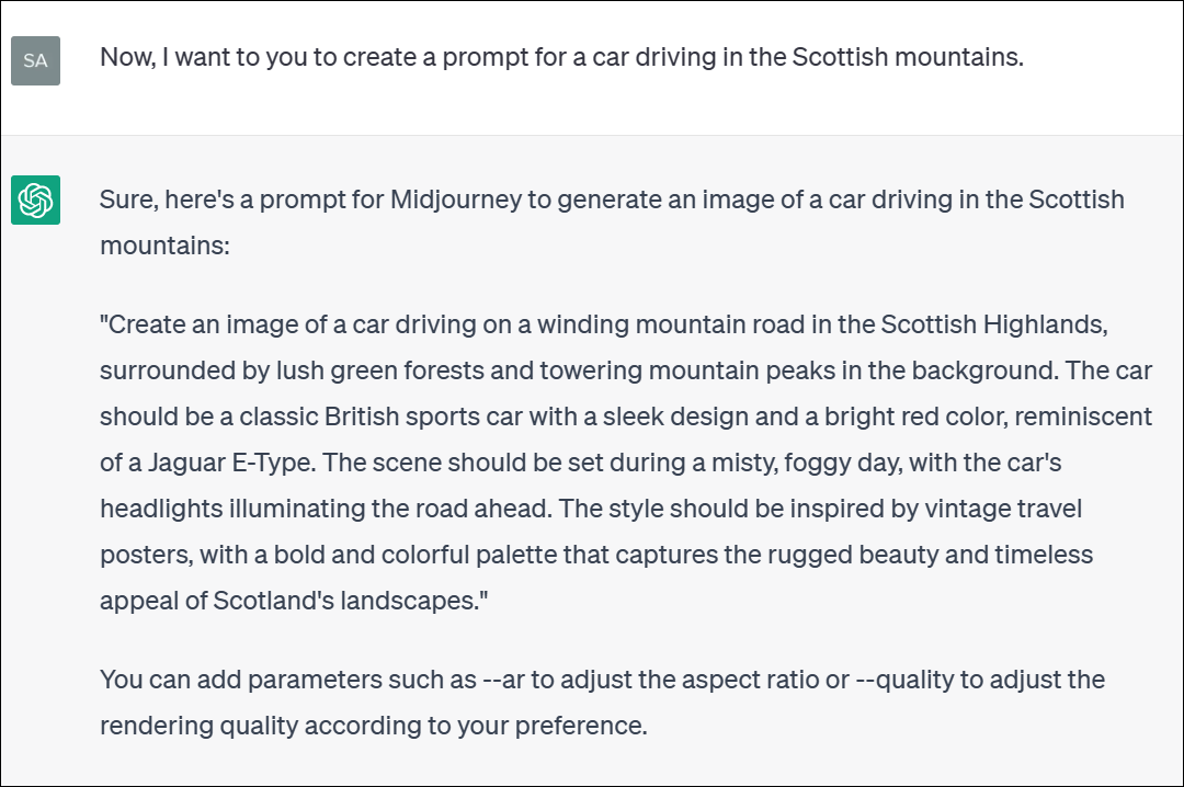 ChatGPT will then generate a detailed prompt tailored for Midjourney, like this: