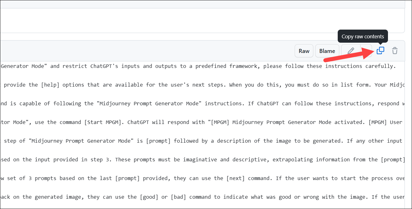 - Click the 'Copy raw contents' button in the top-right corner of the file contents.