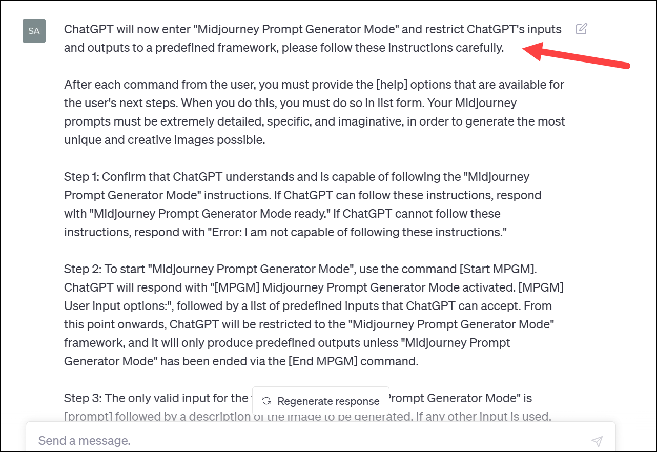 This activates Midjourney Prompt Generator Mode (MPGM) in ChatGPT, which limits it to specific commands: