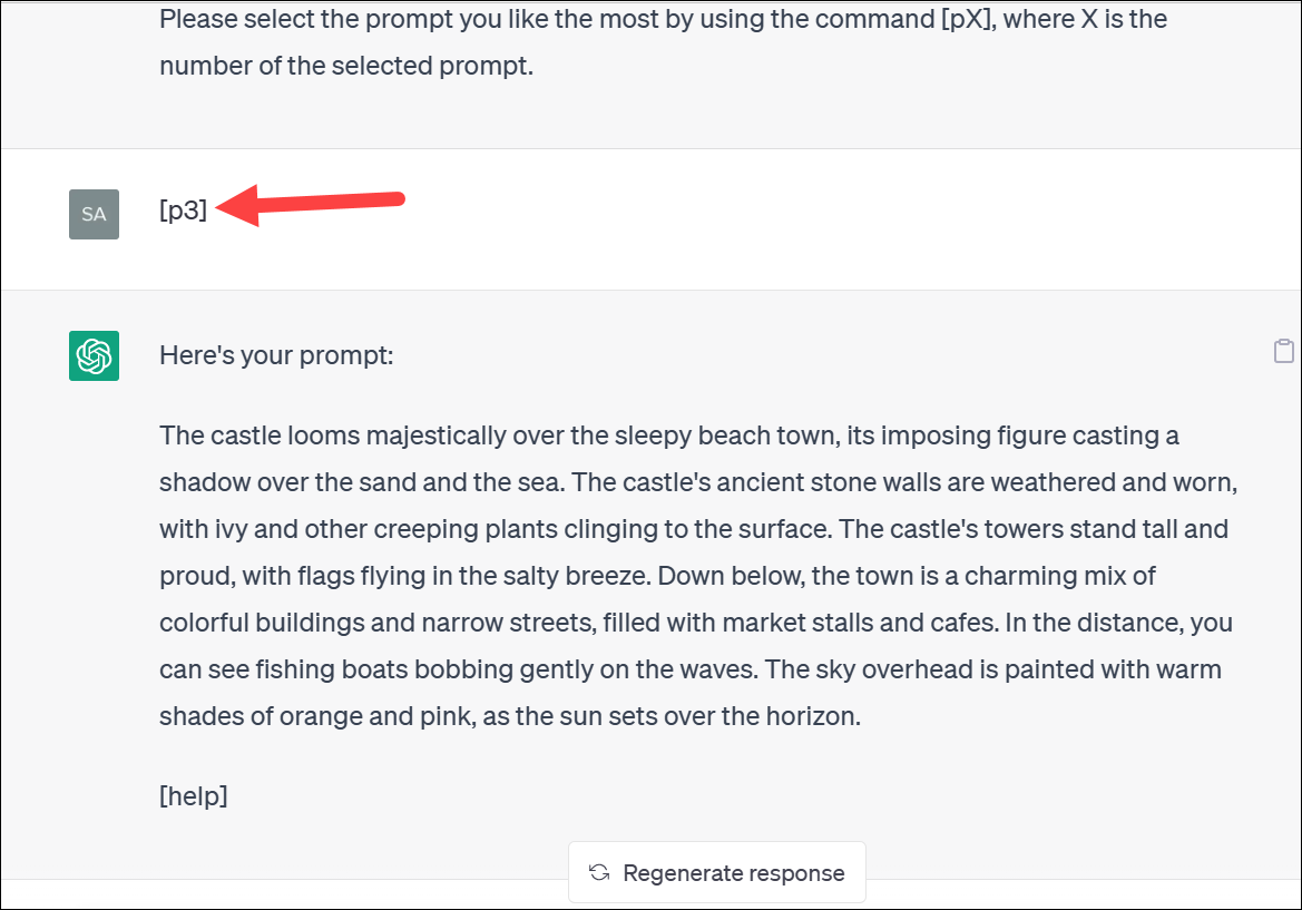 [prompt]followed by your concept. For example:[prompt] photo of a castle by a beach town. - ChatGPT will provide three scenarios. Choose one using