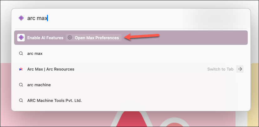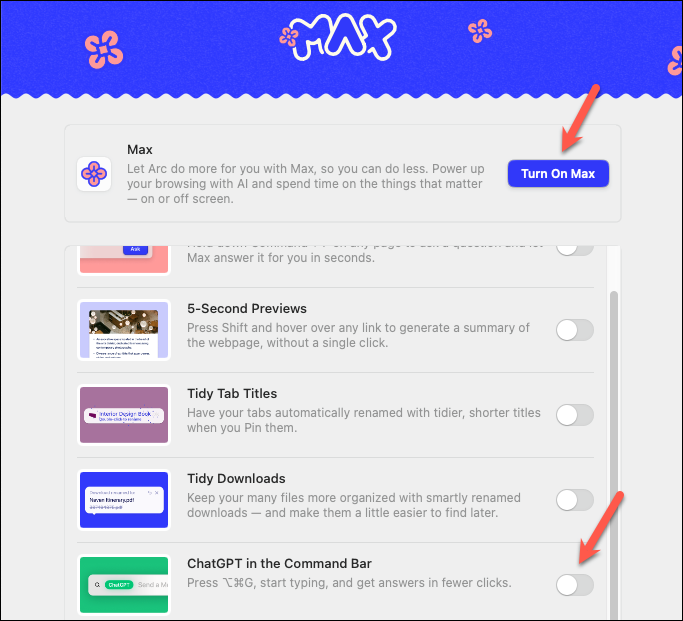 Before you can use ChatGPT directly from Arc's Command Bar, you'll need to enable Arc Max. Arc Max is a set of AI features, of which ChatGPT in the command bar is just one part. Other features include stuff like 5-second page previews/ summaries, tidy page titles, and downloads, and Ask on Page.