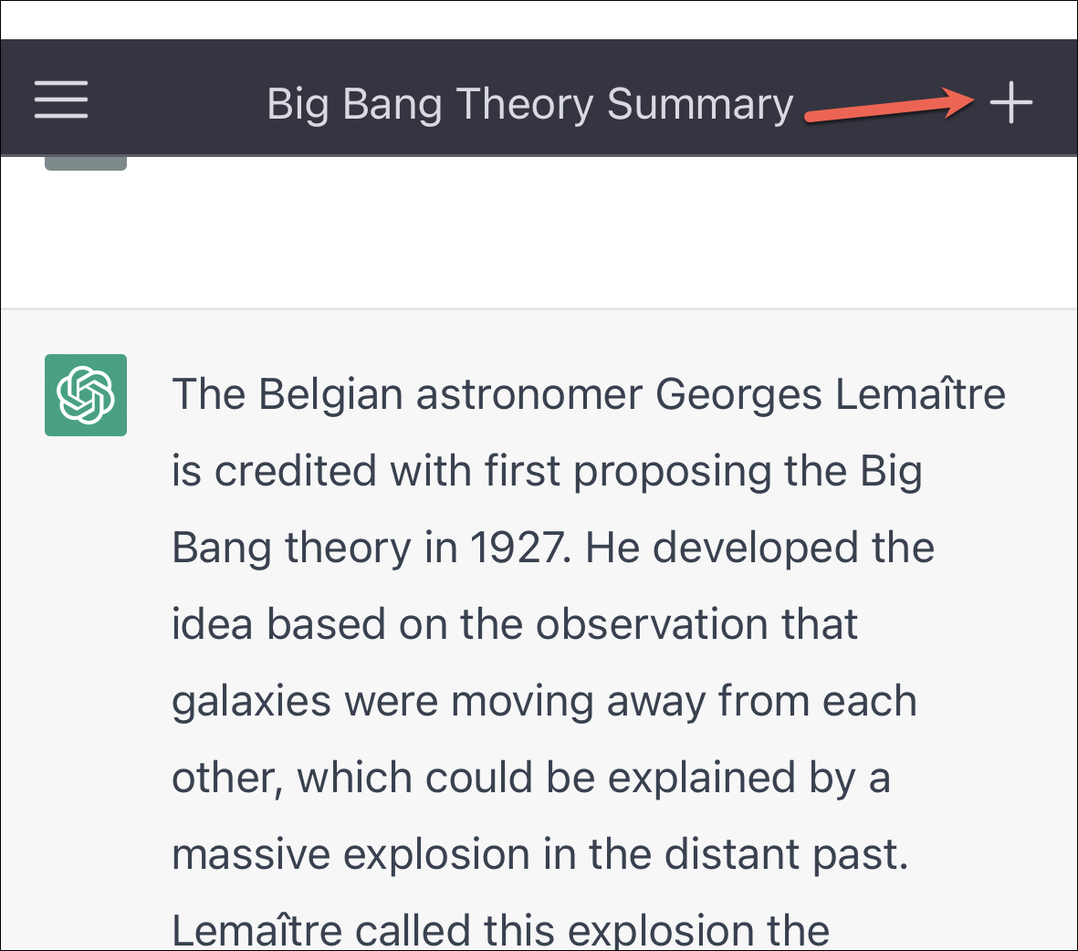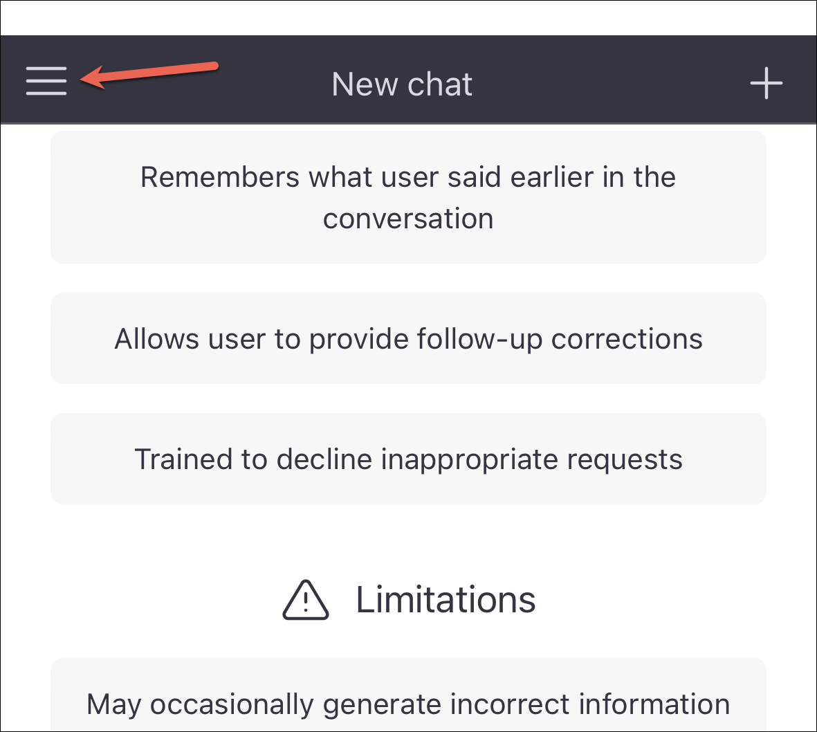 ChatGPT saves your previous conversations but always starts a new conversation whenever you reload or revisit the website. If you want to continue an old conversation, tap the hamburger menu in the upper-right corner of the screen.