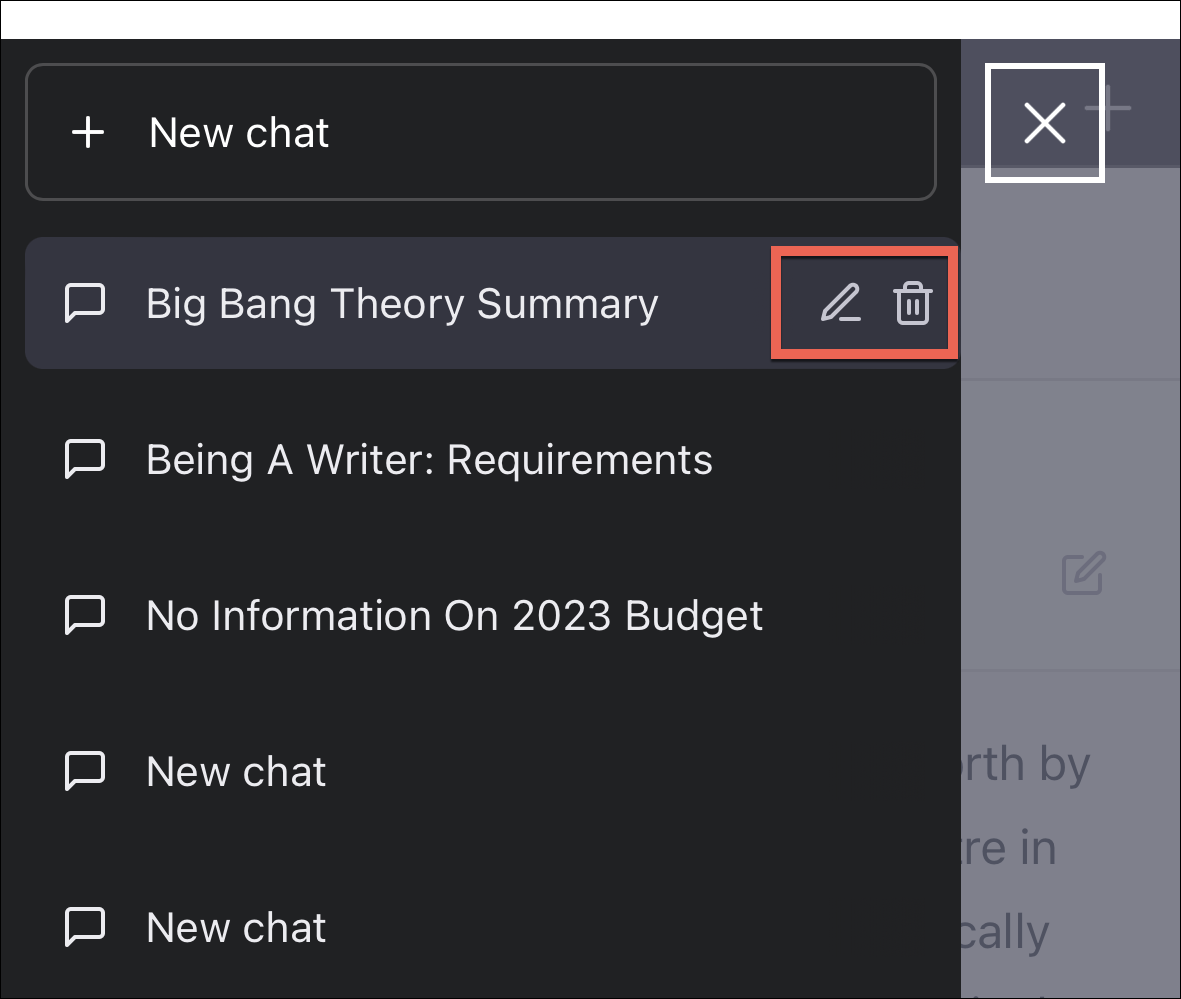 You can also edit the name of a conversation or delete a chat once you have opened it. The options to rename and delete will appear next to the currently selected chat.