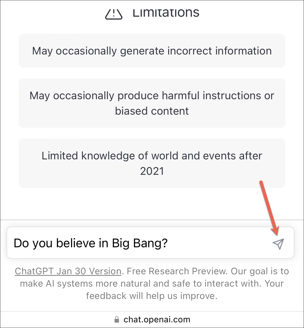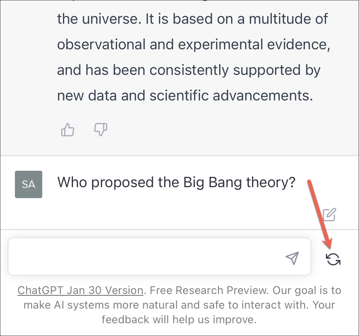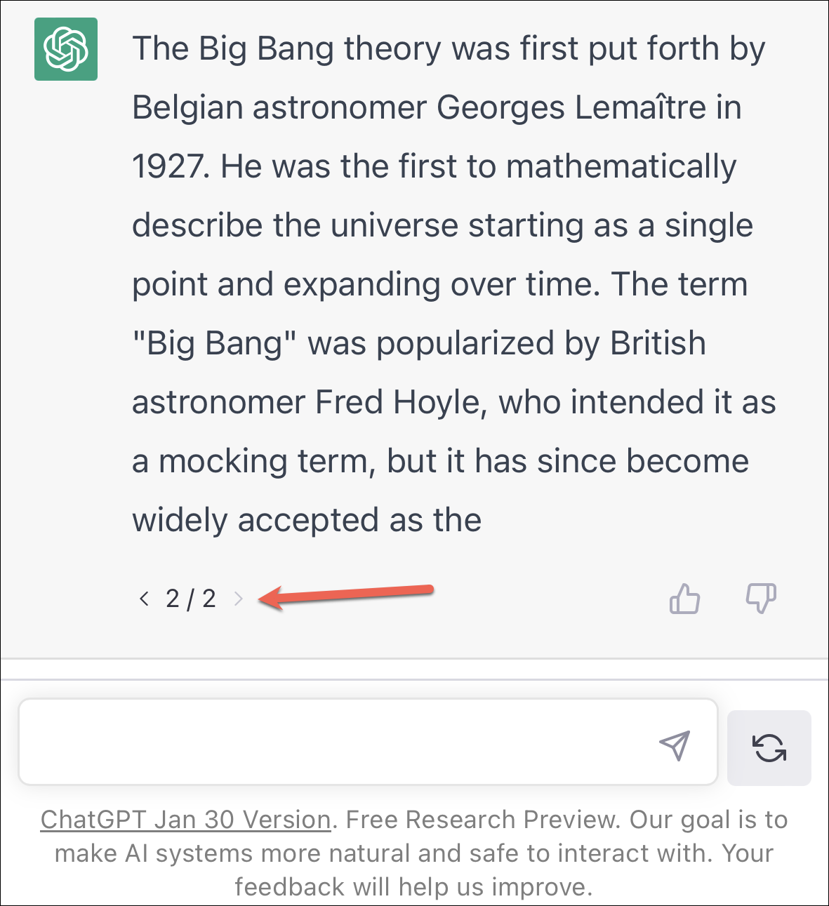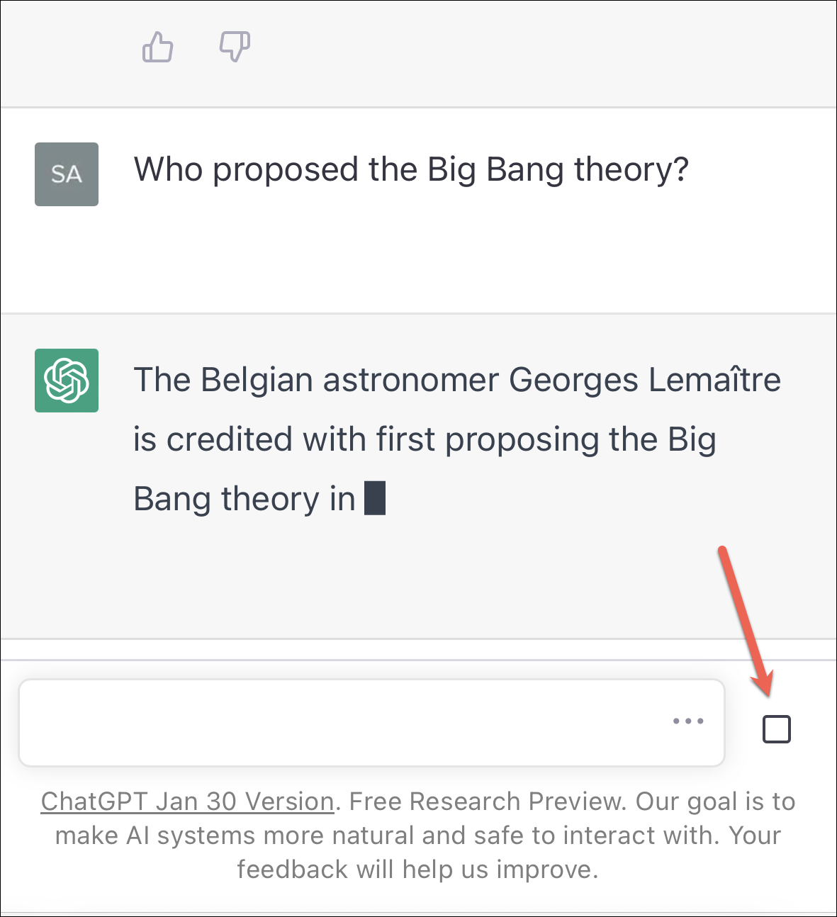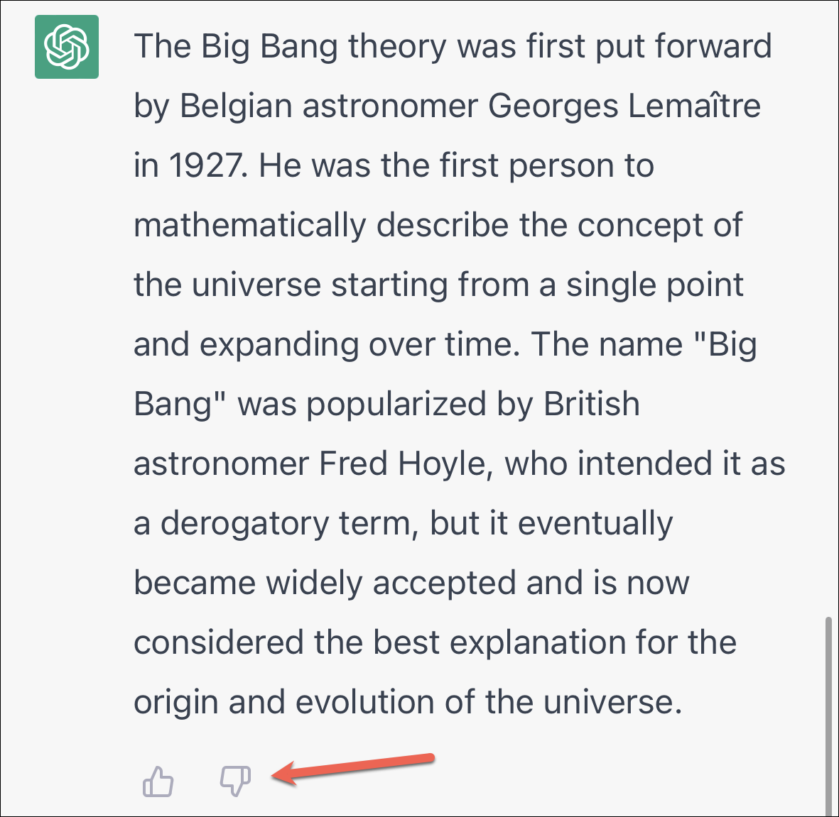 Once the response is completely generated, you can either ‘like’ or ‘dislike’ it to provide feedback to the OpenAI team – their main goal at this stage in the development of ChatGPT. If the answer it produced was what you expected, tap the ‘Like’ button. Otherwise, tap the ‘Dislike’ button and tell the OpenAI team what the answer should have been. Of course, providing feedback is completely optional and does not affect your interaction with the chatbot in any manner.