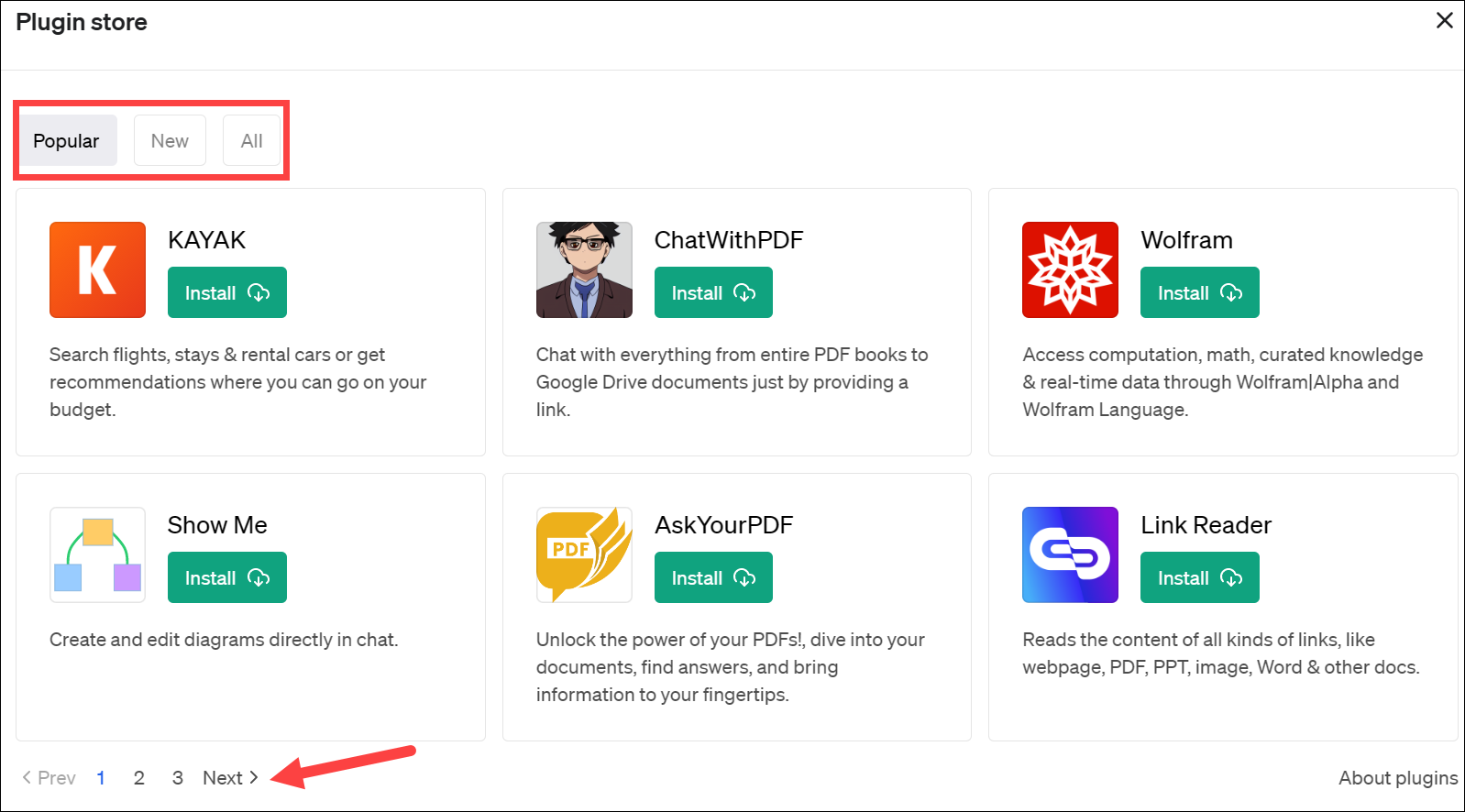 The Plugin store will open where all third-party plugins hang out. You'll find three categories here: 'Popular', 'New', and 'All'. There are hundreds of third-party plugins in the Plugin store and the number is increasing every day.