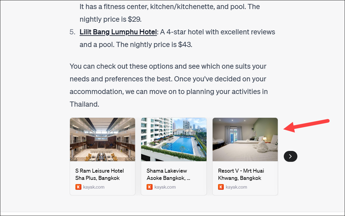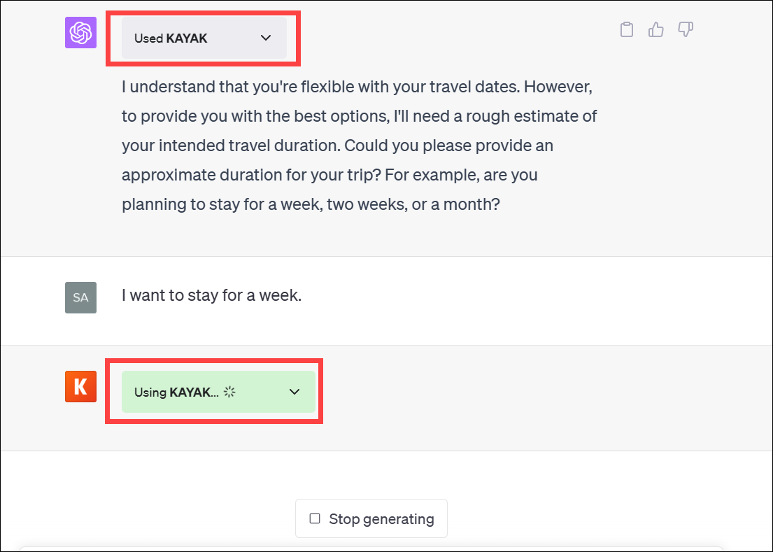 For example, I asked ChatGPT to help me plan to travel a trip. That kicked Kayak into action. It asked for additional information and provided flight and hotel recommendations with booking links.