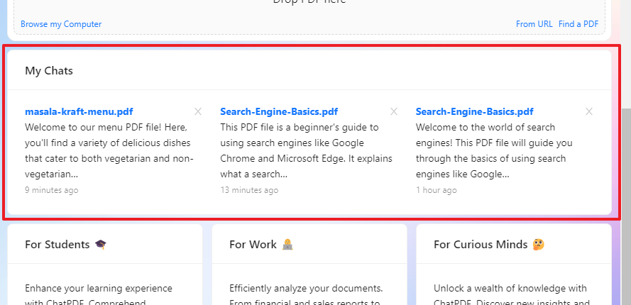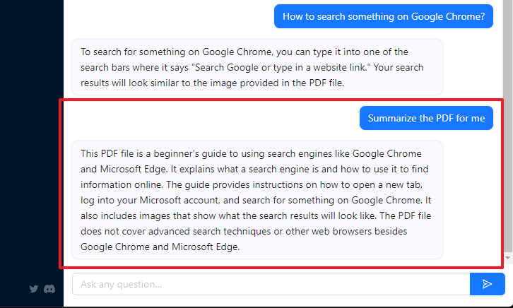 ChatPDF can be really helpful in situations when you have to sift through a large amount of text. It can help you find a particular topic, summarize a PDF, or understand the topic in simpler terms and you can also ask follow-up questions about it.