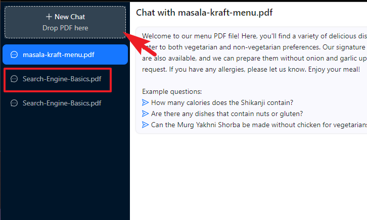 To start a new chat, you can drag and drop a PDF file in the top left corner or you can click on the option and upload a PDF from your computer. Do note your existing chat will move to the sidebar and you can switch easily by clicking on it anytime. Your chat history will not be lost.