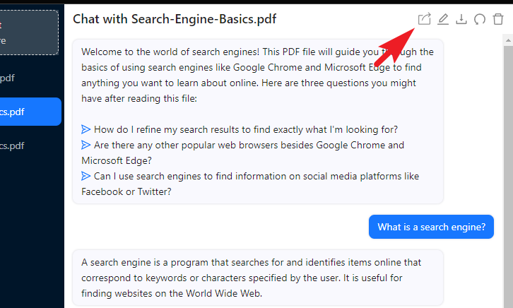 ChatPDF will generate a link for the whole chat; click on the 'Copy link' option and share it with anyone you might think will find it useful. This would share the complete conversation you have had with ChatPDF till then.