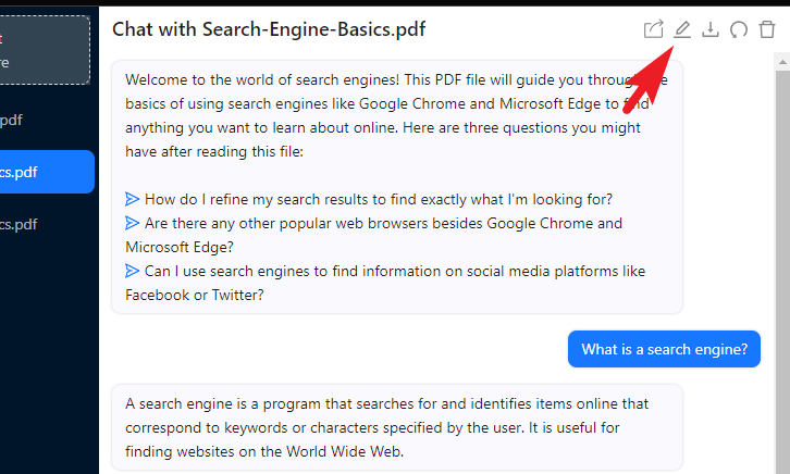 To reset or delete a chat, click on the 'Circular arrow' icon or 'Trash bin' icon respectively. Resetting a chat will clear all the conversation whereas deleting will delete the chat and will also discard the PDF and bring you back to the home screen.