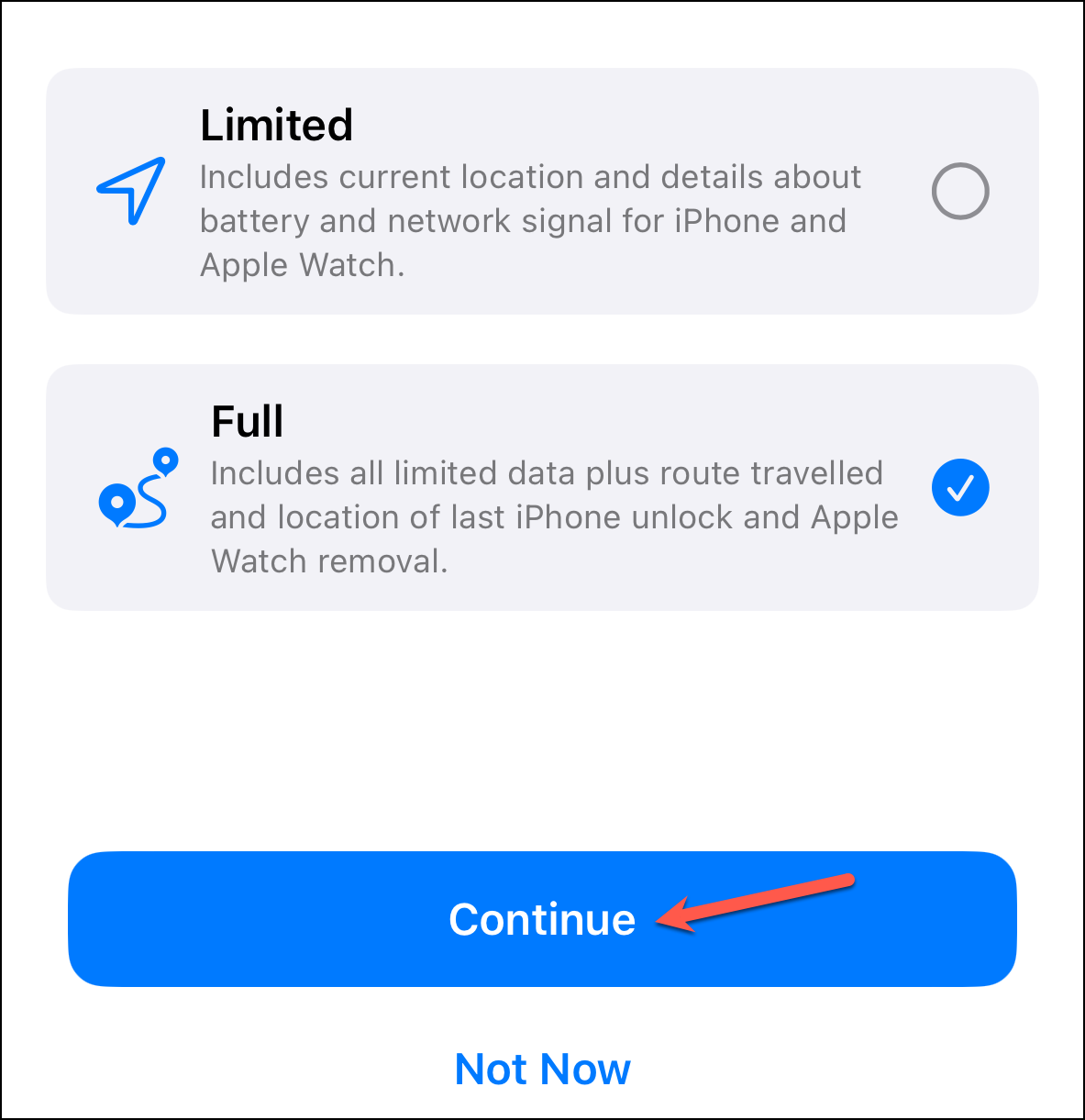 Step 7: Choose the type of data you want to share if you fail to arrive at your destination. You can select 'Limited' or 'Full' data sharing. 'Limited' includes your current location and device information, while 'Full' adds details like your route and the locations where your devices were last active.